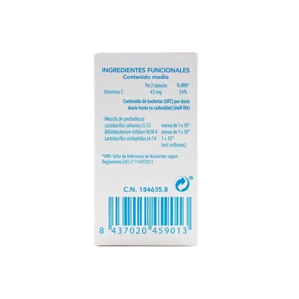 Por 1 cápsula: Vitamina C (43 mg), Lactobacillus salivarius LS33 (menos de 1x109 UFC), Bifidobacterium bifidum BGN4 (menos de 1x109 UFC), Lactobacillus acidophilus LA14 (1x109 UFC).